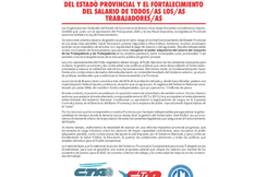 Sin estos instrumentos básicos de gestión se pone en serio riesgo el normal funcionamiento del Estado Provincial en sus áreas más sensibles: Salud, Educación, Justicia, Seguridad y Obra Pública. Asimismo, muchos municipios podrían verse impedidos de afrontar con regularidad el pago de salarios y del aguinaldo. Resulta indispensable contar con fuentes de financiamiento que permitan recuperar el poder adquisitivo del salario del conjunto de los Trabajadores y las Trabajadoras en los ámbitos paritarios, tanto municipales como provinciales. Y así también a los/as trabajadores/as de la educación pública de gestión privada.